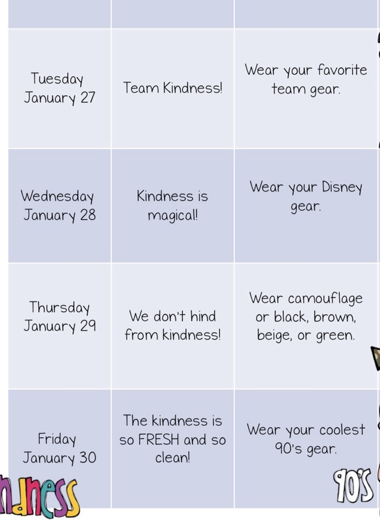 Next Week Grant Middle School celebrates our culture of kindness with The Great Kindness Challenge! Spirit Days included